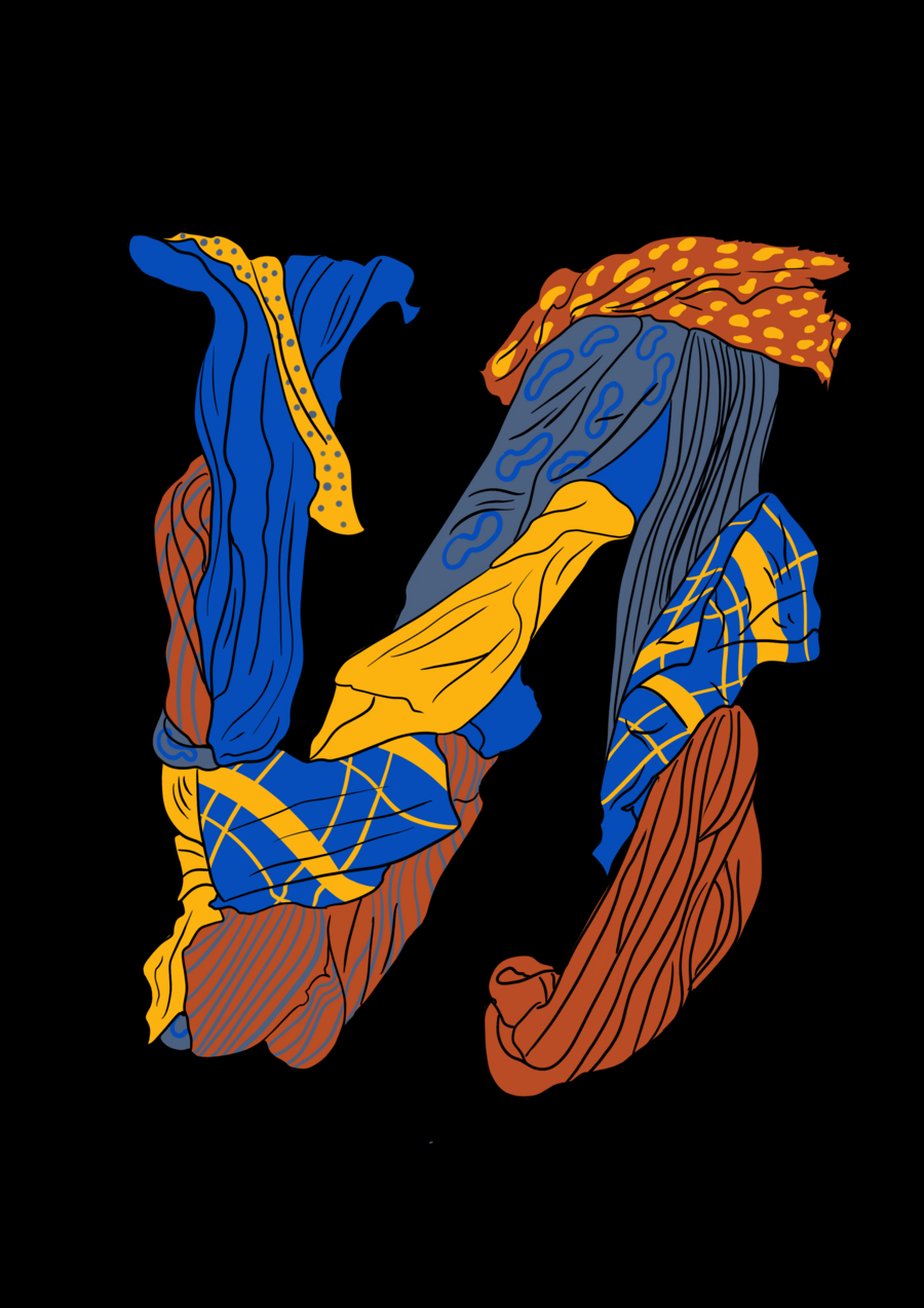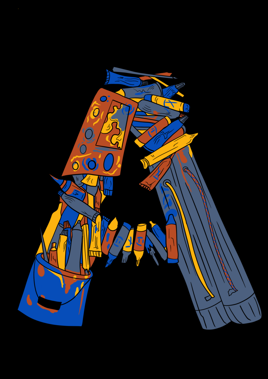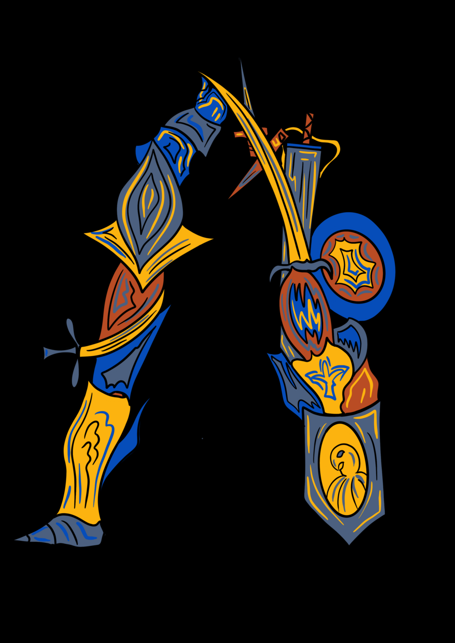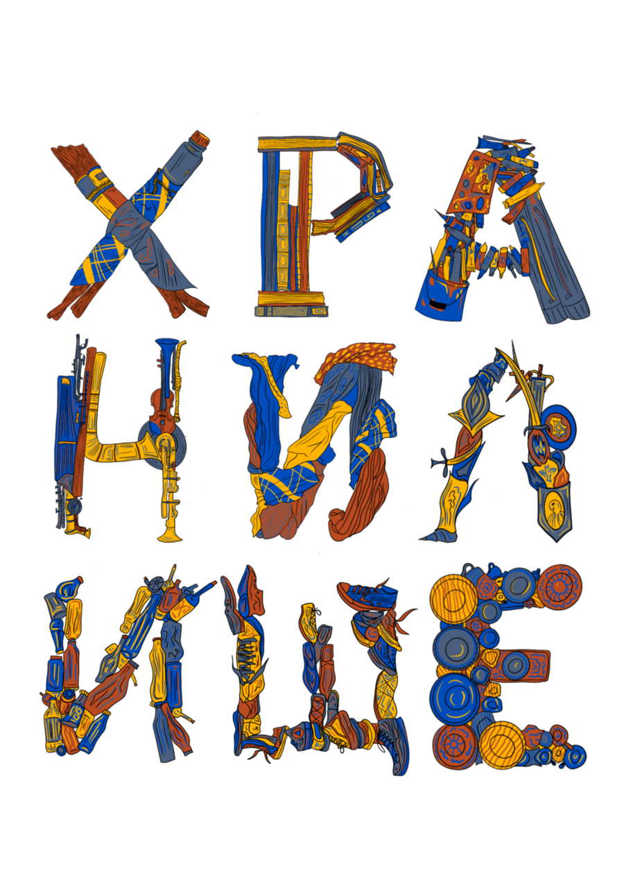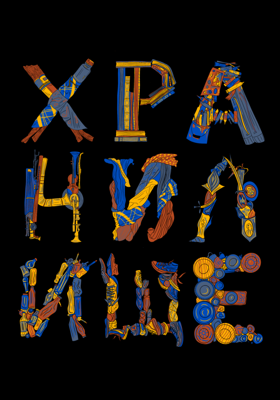 Буквицы, которые складываются в слово «хранилище». Иллюстрации представляют собой вещи, которые хранятся у людей, от походных принадлежностей до доспех рыцаря.