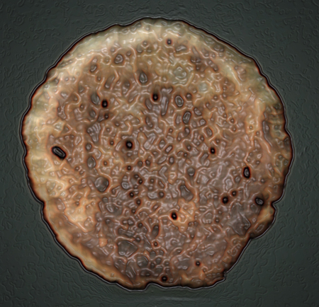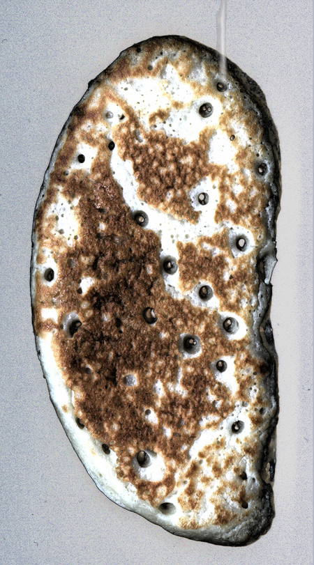 Значительной частью сканированных объектов в коллекции Александра Гермесова являются блины и оладьи. Здесь привносится дополнительная итерация творческого процесса, собственно, выпекание блинов. Подобно демиургу автор погружается в создание образов уже на стадии формирования физических тел. Планетарные блины и астероидные оладьи, рождённые в синтезе яично-мучной смеси и стихии огня ещё теплые, отравляются на сканер, где осуществляется квантовый переход в цифровой слепок. Назначение числового коэффициента здесь надо понимать не столько как интеллектуальное развлечение, а как техническую необходимость маркировки файлов.