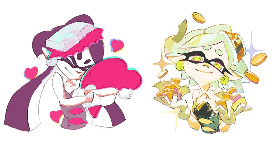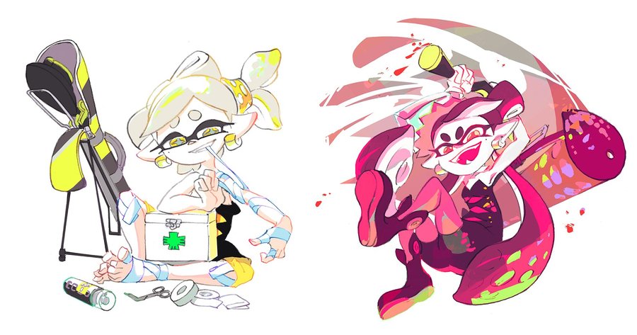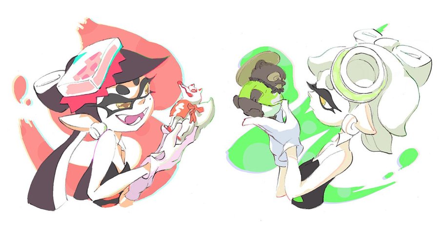 Иллюстрации с Squid Sisters к Сплатфестам: 1. Любовь или деньги 2. Red Kitsune Udon vs. Green Tanuki Soba 4. Pokemon Red vs. Blue 4. Не щадить! против Сосредоточиться на исцелении