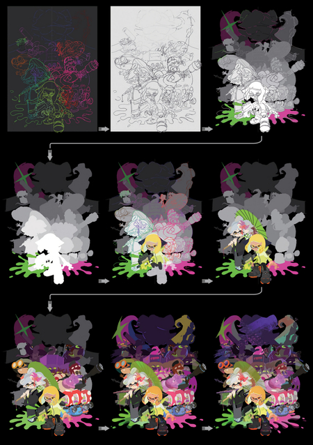 Иллюстрация для одиночного режима Splatoon 2, а также прогресс её создания, 2017