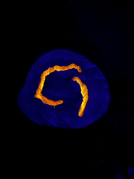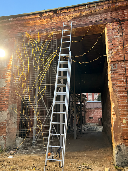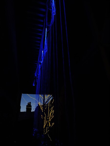 материалы инсталляции: — оптоволокно (цвет — синий) — светодиодная неоновая лента (цвет — желтый) — органический пластик для 3D-принтера (цвет — желтый) — сетка рабица — спилы деревьев — светодиодные светильники (цвет — желто-оранжевый)