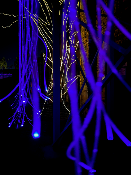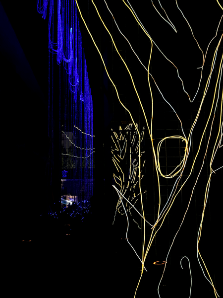 Синее оптоволокно создает атмосферу звездной ночи, а теплый желтый свет деревьев и пеньков напоминает людям о незаменимых и ценных благах, которыми делится с нами природа.