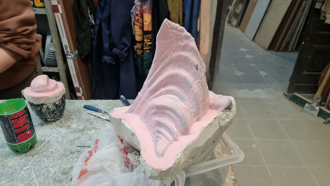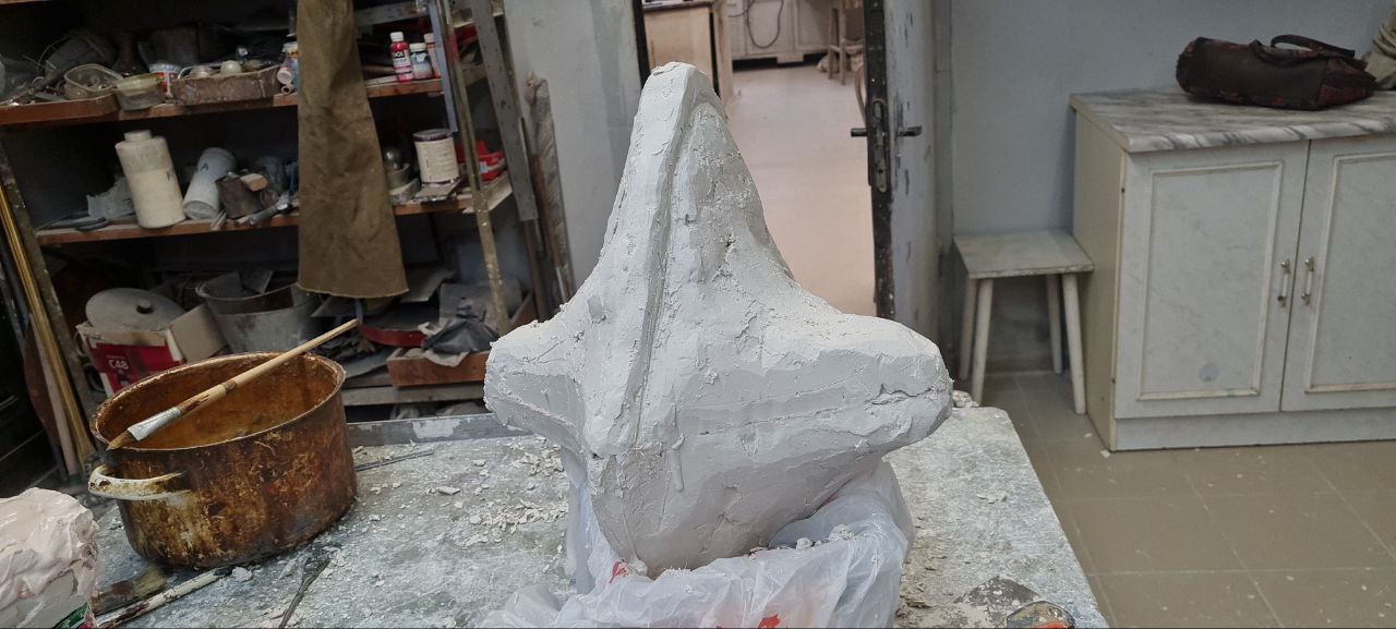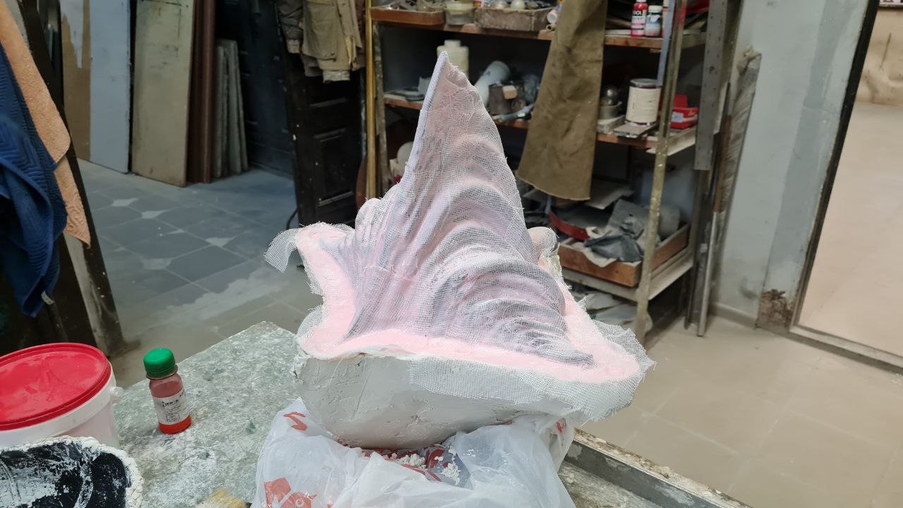 После нанесения необходимого количества слоёв герметика и армирования, форма смазывается и поверх моделируется гипсовый кожух, который позволит сохранить форму модели при отливке восковки.