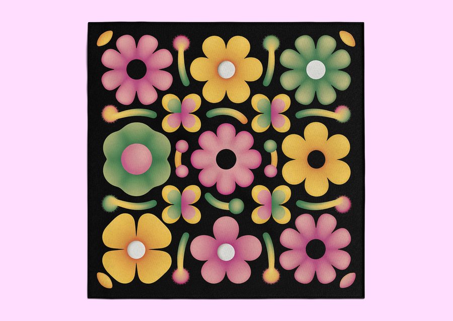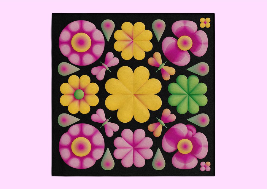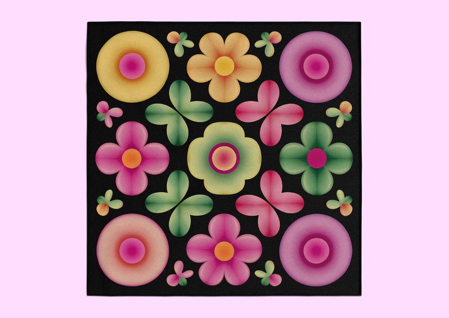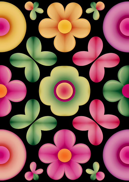 Промт: Featuring abstract, colorful flowers and butterflies with a smooth, gradient, and vibrant appearance. Use bright and saturated colors such as pink, yellow, green. The flowers should have simple, bold shapes with gradient fills that blend smoothly between colors. Butterflies should be stylized with matching color schemes. The background should be solid black to enhance the vividness of the elements. Creation should combine vector art.