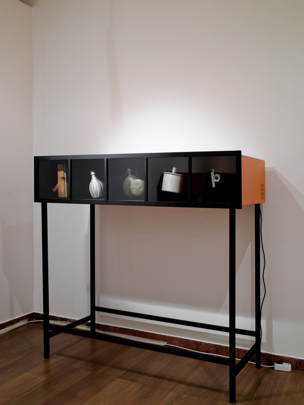 The interactive installation of the Frightening Collection consists of several long horizontal boxes divided into separate sections. Each section contains an object that reacts to the viewer ' s touch of the glass. Boxes in turn differ thematically: boxing with moving everyday objects; boxing with old (artistic) things; boxing objects singing «angelic songs», etc.