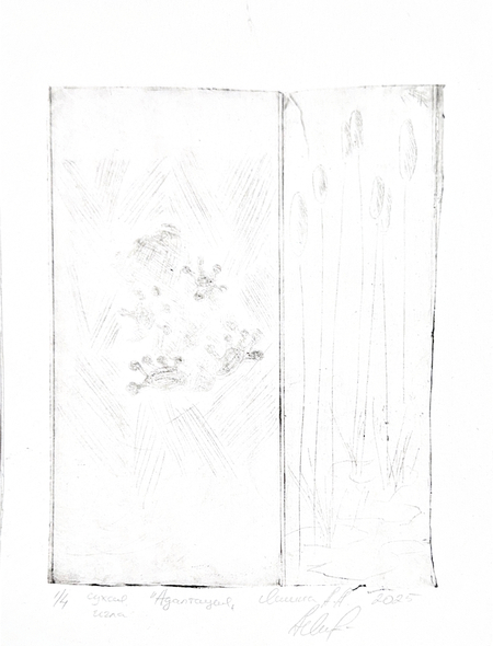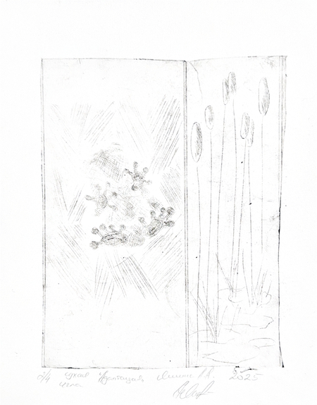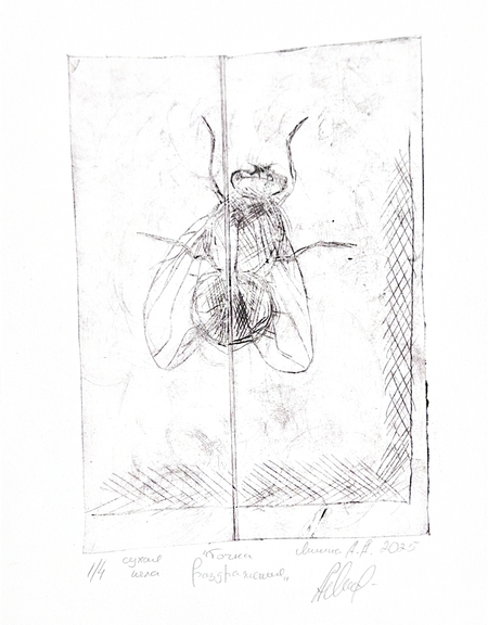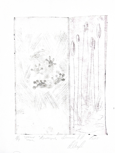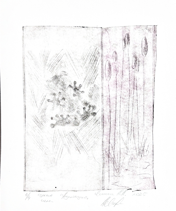 «адаптация» сухая игла, акварельная бумага (белая), 200×250 мм
