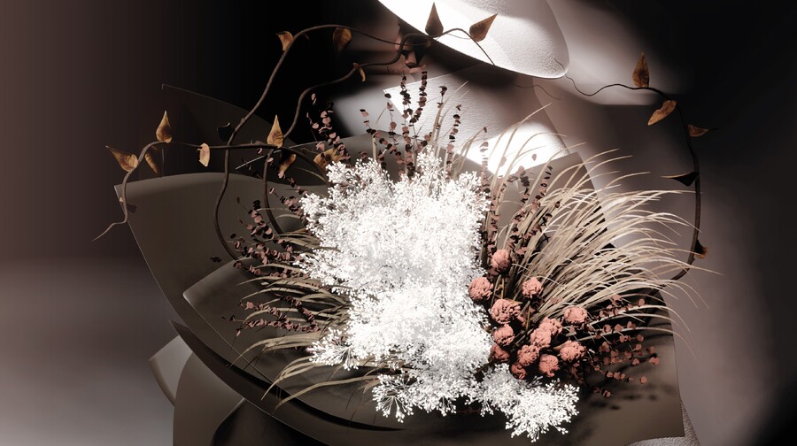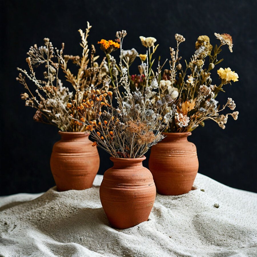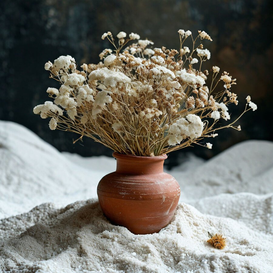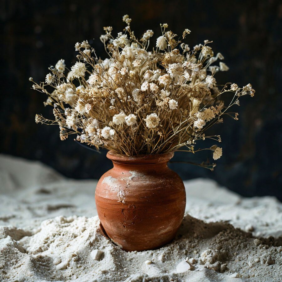 Изображения товара сгенерированы в нейросети Шедеврум. Промт: букеты сухих цветов в глиняных горшках в горе из белого песка, темная атмосфера, тусклый свет.