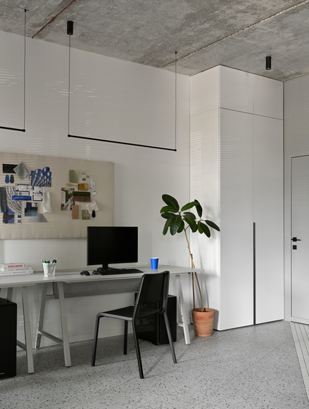 Колористика стала нашим главным союзником в создании нужной атмосферы. Акцентом стали колонны, окрашенные в глубокий и насыщенный синий, цвет глубин Балтийского моря и предзакатного неба. В отделке помещения мы использовали простые материалы, которые всегда можно обновить или заменить. Ведь дизайн студия это живой организм и вместе с нашим ростом меняется и пространство. Поэтому для отделки стен мы выбрали покраску, а для напольного покрытия нейтральную плитку под терраццо.