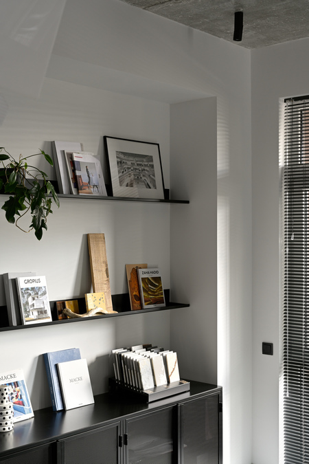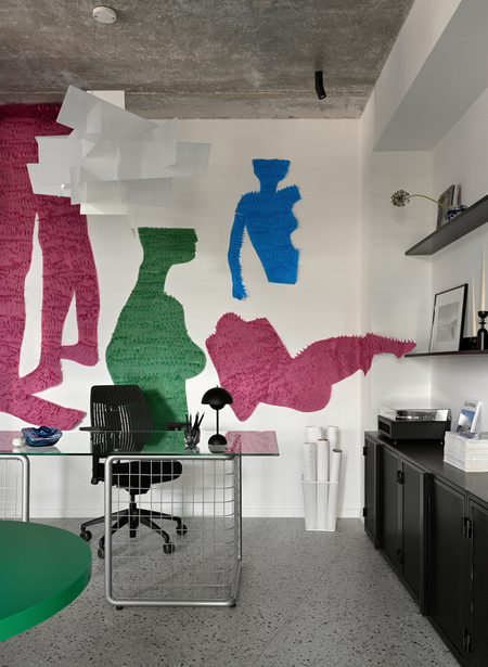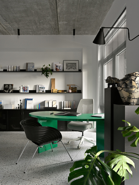 Основная идея проекта заключалась в том, чтобы максимально проявить характер помещения, но одновременно сделать архитектуру и нашим холстом, на котором мы можем демонстрировать то, что мы любим и ценим: искусство, винтаж и природу. Нам хотелось, чтобы студия была не просто рабочим офисом, но и в какой-то степени художественной галереей, поэтому у нас есть декоративные панно из серии «Тайны светлых снов» — Дмитрия Чайки (галерея ArtGart) и подиумы для выставки скульптурных работ, а брутальный стеллаж хранит наши сокровища, которые мы привозим из других стран или приобретаем у местных художников.