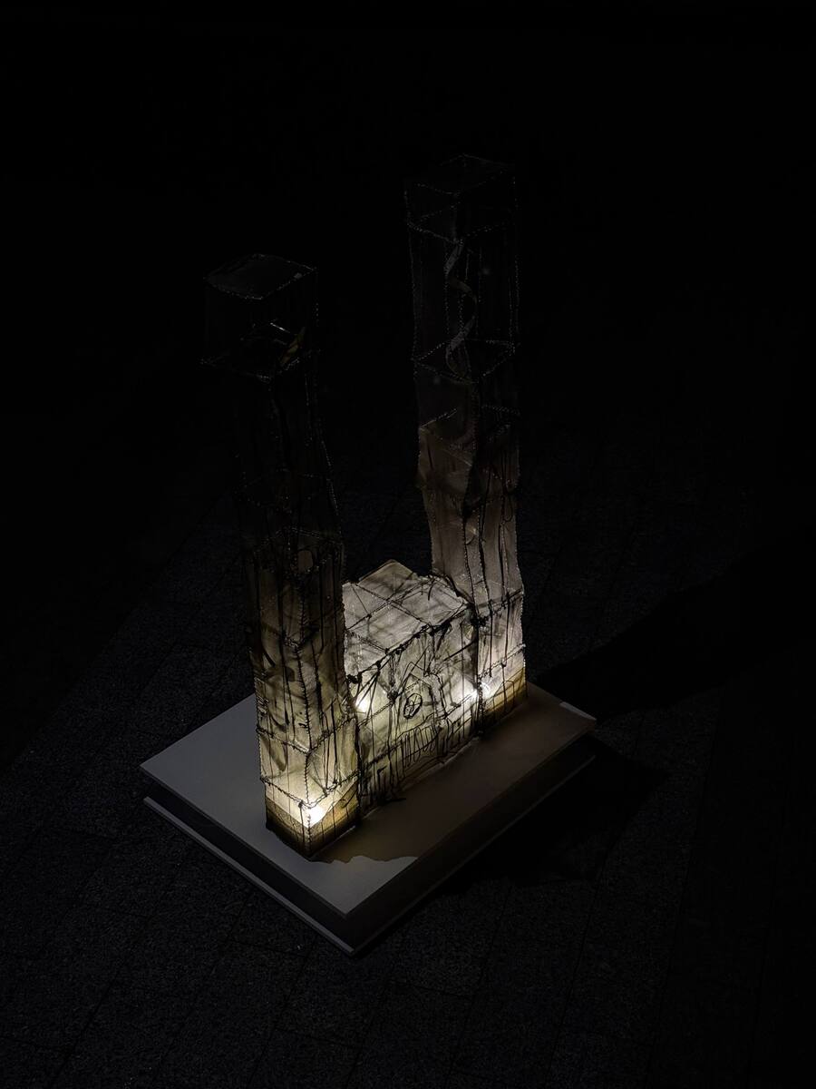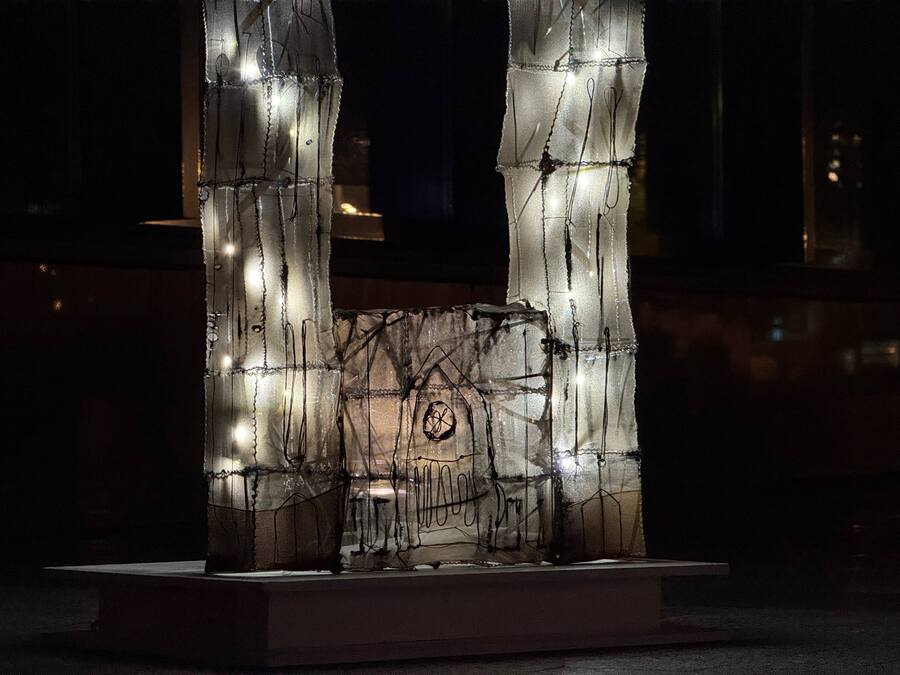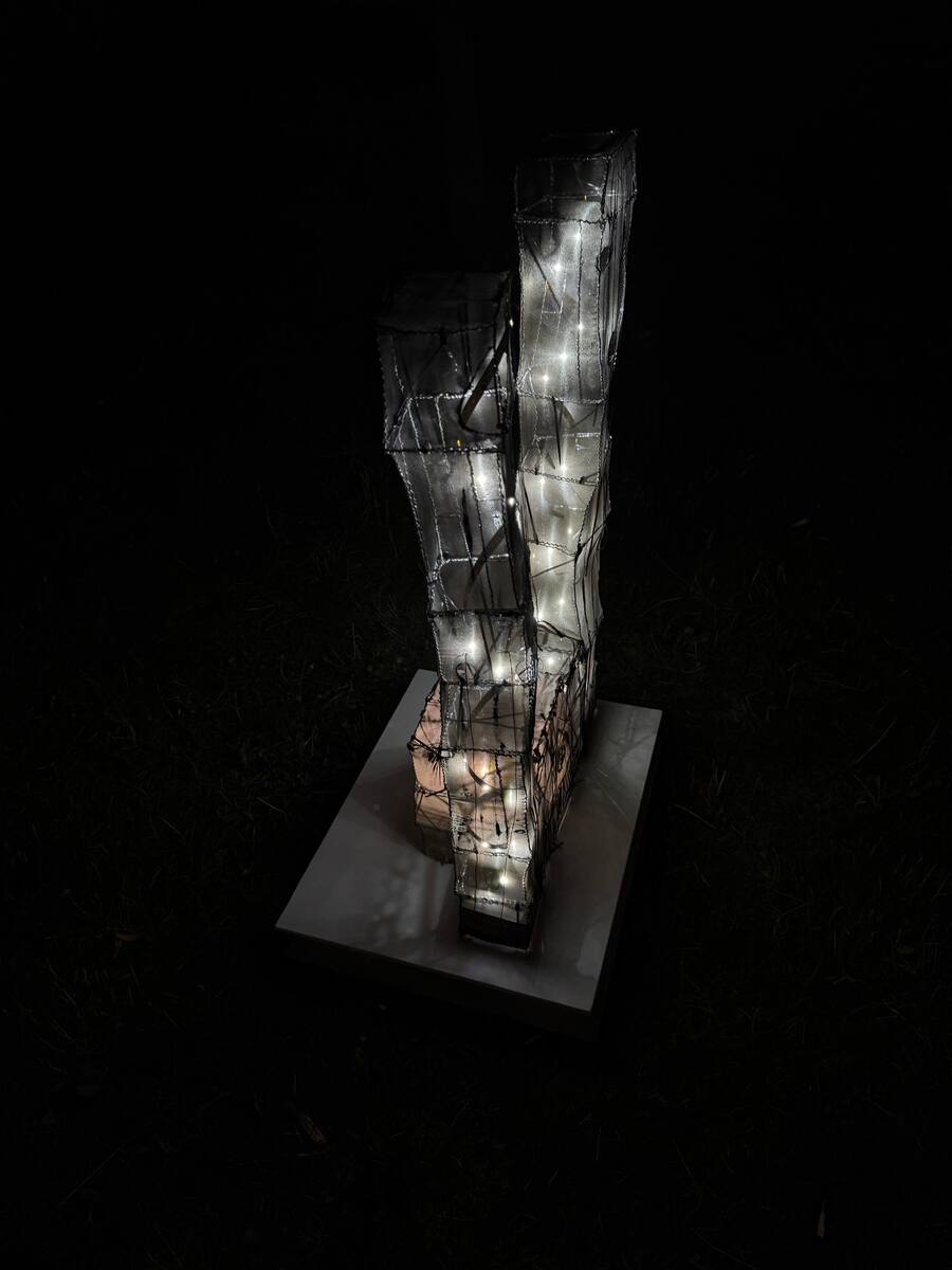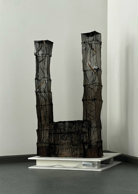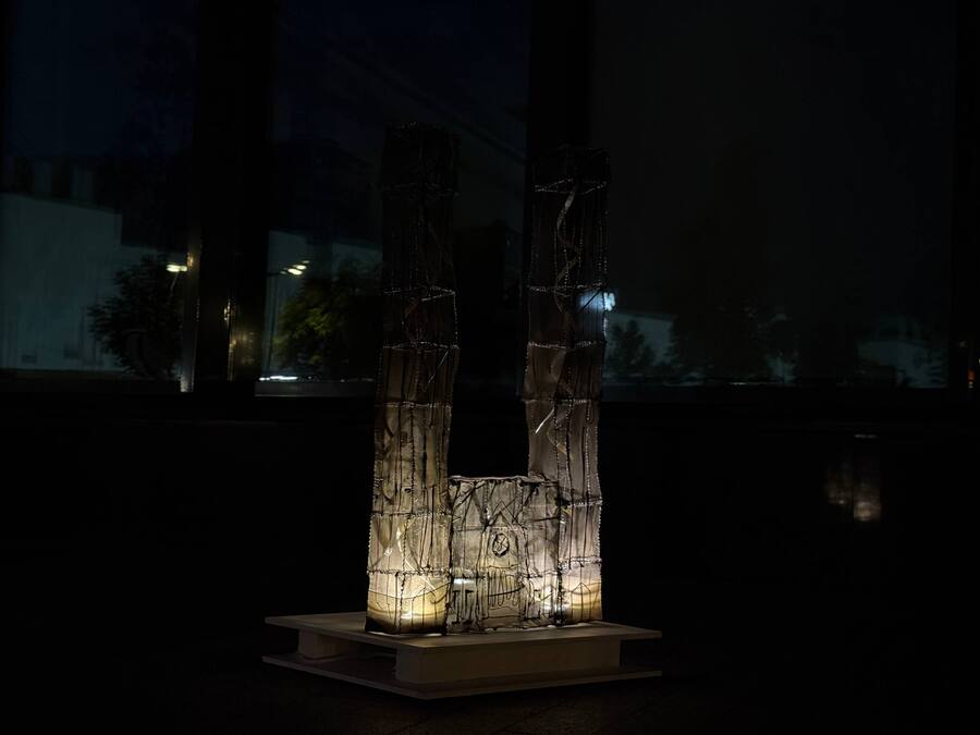 Проект «Notre-Dame» — напольный светильник, воплощающий концепцию готического собора. Он состоит из двух частей: платформы из белых фанер и брусков со спрятанным светильником внутри и верхней части — каркаса, выполненного из плетёных из проволоки кубиков и параллелепипедов, стянутых черными хомутами-стяжками. Каркас напоминает силуэт готического собора, обтянут капроновой тканью от колготок, на которой вышиты черными нитками архитектурные детали. На натянутой ткани есть небольшие дырки, густые мазки черной краски. Они добавляют выразительность, имитируя тень и текстуру готического узора. Этот проект сочетает в себе свет, материалы и текстуры, передавая атмосферу духовного величия и художественной интерпретации готической архитектуры.