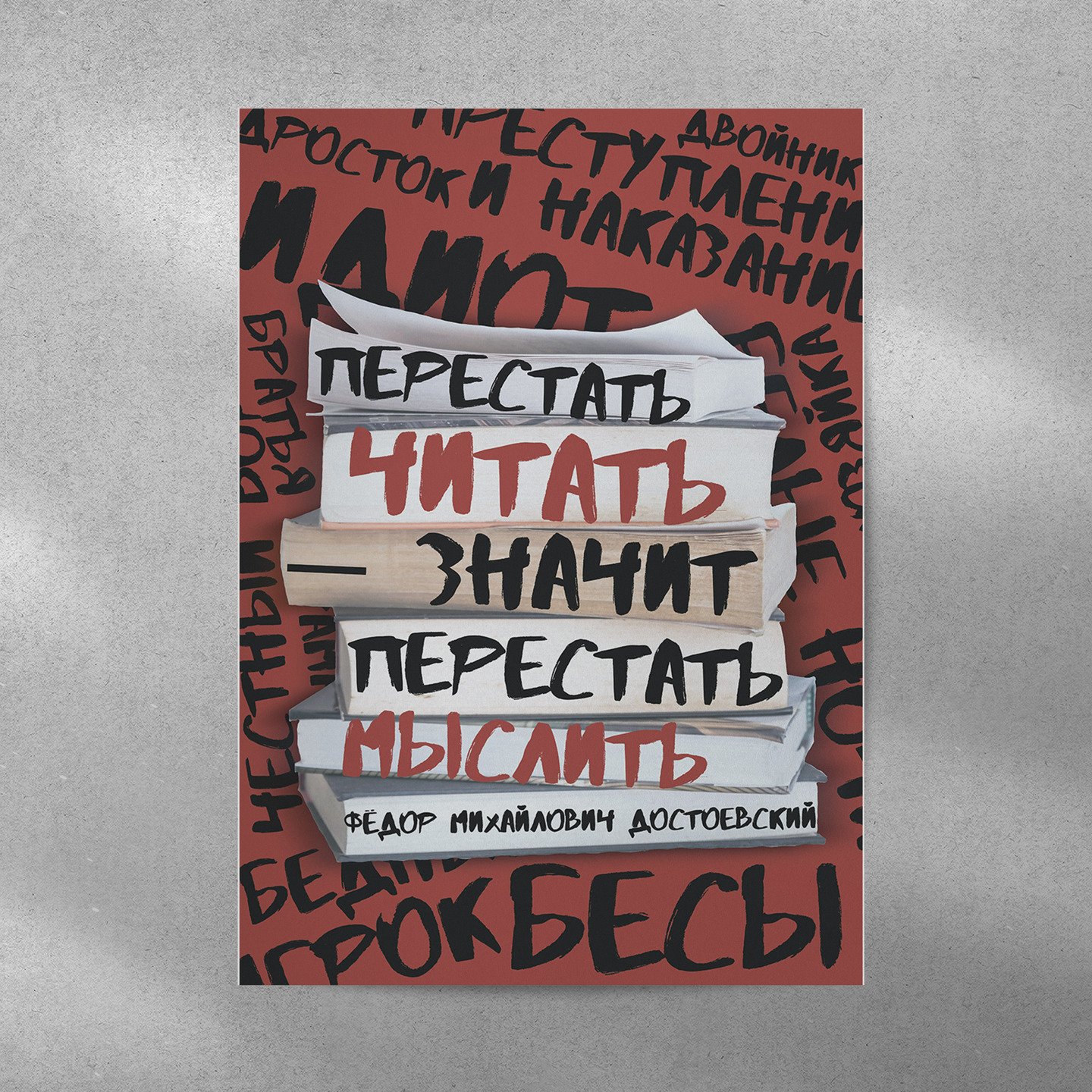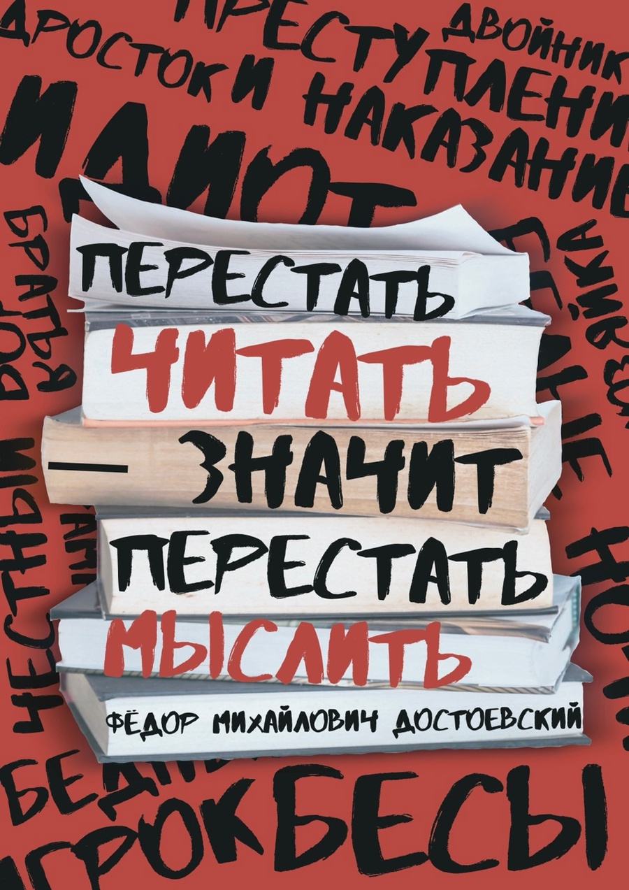 Работа, созданная на конкурс HSE CREATIVE OPEN Summer 2024 в номинации «Плакат». Целью плаката было обыграть цитату Ф. М. Достоевского. Цитата писателя расположилась на стопке книг, за которой перечислены произведения самого Достоевского, для подчёркивания смысла сказанных им слов.