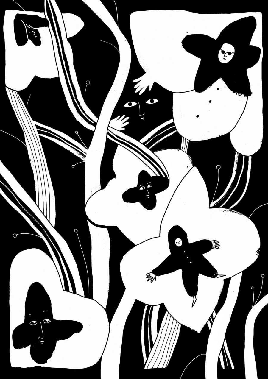 В пересечениях линий, наложениях форм и пространстве «между» рождаются лица и персонажи. Их безразличие к наблюдателю делает из любопытной человеческой фантазии отличного зрителя, а саму природу — увлекательным местом действия.