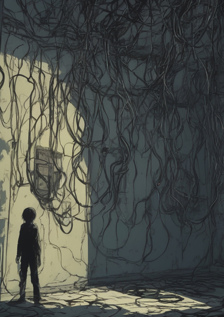 promt = «90s anime style, horror, A dark, abandoned room with wires hanging from the ceiling like tentacles, entwining a lone figure struggling to break free»
