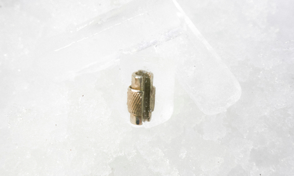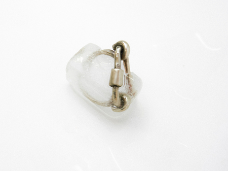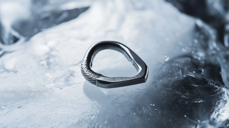 /imagine prompt: A simple yet elegant ring inspired by a climbing carabiner, its band shaped with a sleek curve mimicking the locking mechanism. Crafted in brushed silver, the design includes fine engraved details resembling rope textures. The ring is placed on a matte ice surface, with hard lighting highlighting its metallic sheen. Minimalist, hd quality, artisanal craftsmanship, mountaineering aesthetic, contemporary jewelry style