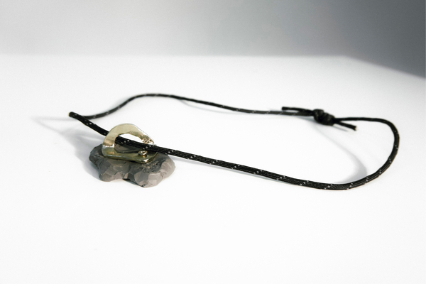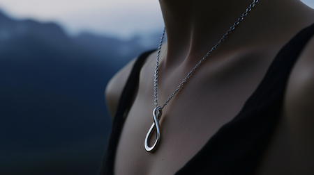 /imagine prompt: An elegant necklace with a figure-eight safety pendant, its sleek design contrasts with a fine silver rope chain. The chain runs through the carabiner, creating a bold, modern look. Photographed in the far background against a dark gray chipped freestanding stone in soft, diffused light that highlights the metal finish and intricate details of the chain. Artistic, rough yet sophisticated jewelry and product photography in hd format