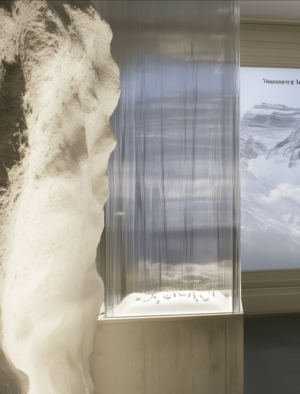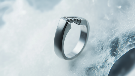 /imagine prompt: A modern, elegant ring designed to resemble the shape of an ice axe handle. The band is matte titanium, with a polished edge simulating the tool’s blade. The design includes subtle engravings of climbing ropes as accents. Photographed on a frosted glass surface with a snowy, white gradient background. Clean, luxurious, mountaineering-inspired jewelry, hd quality, studio lighting