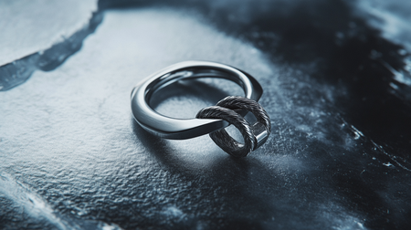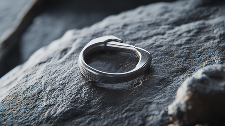 /imagine prompt: A simple yet elegant round ring inspired by a climbing carabiner, its band shaped with a sleek curve mimicking the locking mechanism. Crafted in brushed silver, the design includes fine engraved details resembling rope textures. Photographed on a frosted glass surface with a snowy, white gradient background with soft lighting highlighting its metallic sheen. Minimalist, ultra hd quality, artisanal craftsmanship, mountaineering aesthetic, contemporary jewelry style