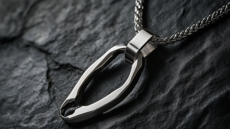 An elegant necklace with a pendant in the form of a titanium carabiner, its sleek, angular design contrasting with a thin silver rope-style chain. The chain passes through the carabiner, creating a bold, contemporary look. Photographed close-up on a dark gray stone background with soft, diffused light that enhances the metallic finish and intricate chain details. Artistic, rugged yet refined, hd jewelry photography