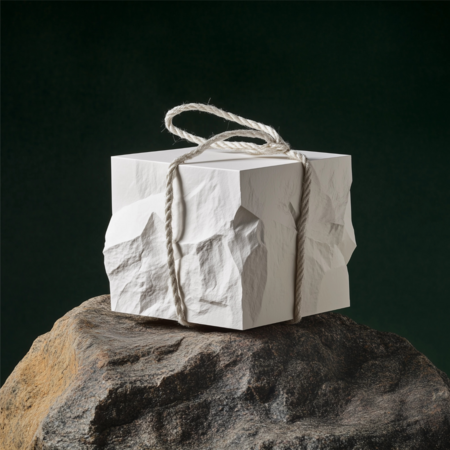 Мешочек для изделий: /image prompt: A white cube shaped jewelry box made of dense cardboard inspired by alpine rocks, with beveled edges mimicking rock formations, tied with a faux climbing rope loop. Studio photography, the box stands on a rock against a dark green background, professional product photography, clean composition, highly detailed textures.