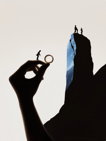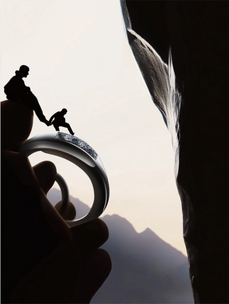 Постер: /imagine prompt: A poster for Vertical Jewelry Store, depicting a dramatic composition of mountain climbers silhouetted against a towering mountain at sunrise, where there should also be a silhouette ring to show that this is a jewelry store. The design incorporates bold vertical lines inspired by rock texture, with soft gradients of light and shadow symbolizing the journey to the summit. Elegant metallic accents highlight the store’s sophistication, minimalistic yet impactful design, cinematic lighting, high detailing, professional typography, modern and artistic style.