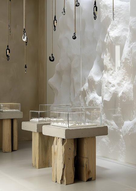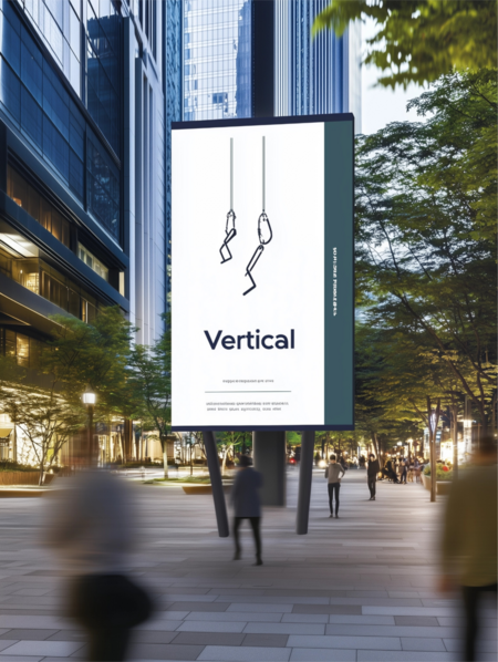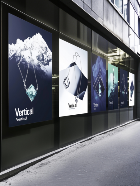 /imagine: Realistic scene with paper posters on the walls for the jewelry store «Vertical», inspired not only by the external forms of mountaineering equipment, but also by its philosophy. «Vertical» symbolizes the struggle for balance, striving upwards and awareness of each step. The jewelry emphasizes not only the strength of the climber, but also the beauty of his path: from difficult decisions to the joy of the conquered summit. Minimalistic vector design with bold, clean typography and abstract shapes of mountains, jewelry and ornaments in the form of mountaineering equipment, deep blue, green and white colors placed on a street wall, soft diffused lighting, ultra-HD quality