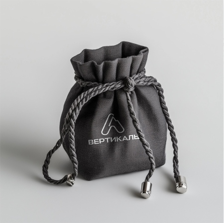 Мешочек для изделий: /image prompt: Charcoal colored textured linen jewelry bag. Drawstring closure with braided cords like climbing rope and silver-colored metal plugs. Photographed as a studio product shoot, direct soft light, light gray background.