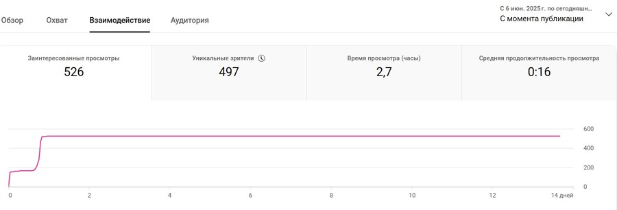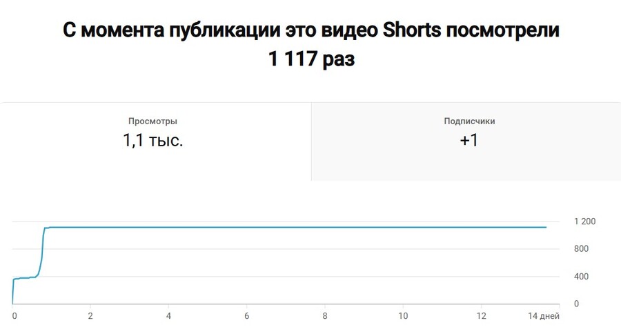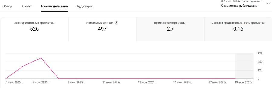 Результаты: 1 123 просмотра; 527 заинтересованных просмотров; 1 подписчик; 4 лайка; 1 комментарий.