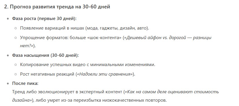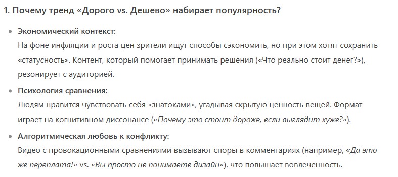3. Я выявил зарождающийся тренд на YouTube: 'Дорого vs. Дешево'. По этому тренду, пожалуйста: Объясни, почему он сейчас набирает популярность. Спрогнозируй, как он будет развиваться в ближайшие 30-60 дней на YouTube. Предложи три уникальных ракурса для контента, которые используют этот тренд до того, как он достигнет пика или станет слишком насыщенным. Предоставь убедительный 'крючок' для каждой идеи контента. Определи 2-3 потенциальных сигнала, которые указывали бы на то, что этот тренд входит в фазу 'пика' или 'спада' на YouTube (например, снижение вовлеченности на новых видео, повторяющиеся форматы контента, смена настроений на негативные).