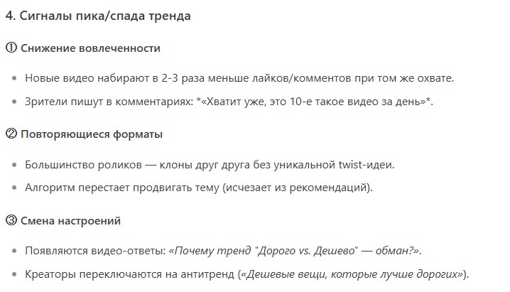 Эти промты помогли мне выявить тренды в YouTube Shorts, цепляющие моменты, сценарий, почему этот тренд появляется в рекомендациях.