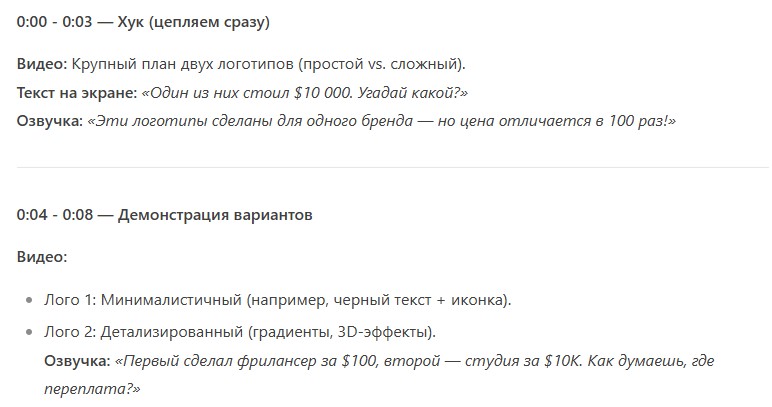 4. Как опытный создатель YouTube Shorts (или сценарист), твоя задача — написать короткий сценарий для видео на тему Дорогой vs. Дешевый/логотип, включая основные тезисы, визуальные идеи и примерный хронометраж.