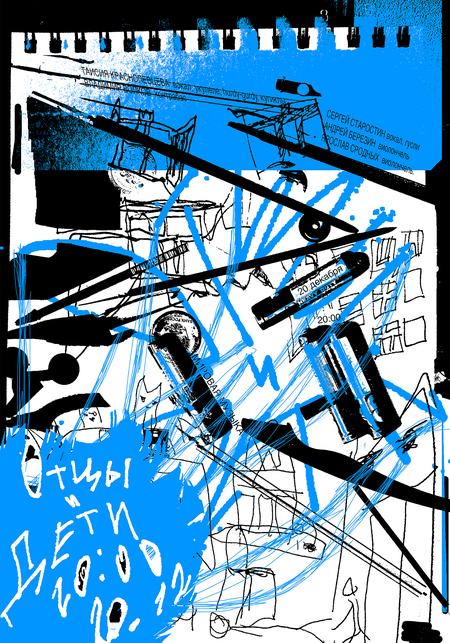 Для мероприятия под названием «Отцы и дети» в рамках Лаборатории плаката была разработана афиша, которая сочетает в себе сканированные объекты и рисунки, выполненные карандашом.
