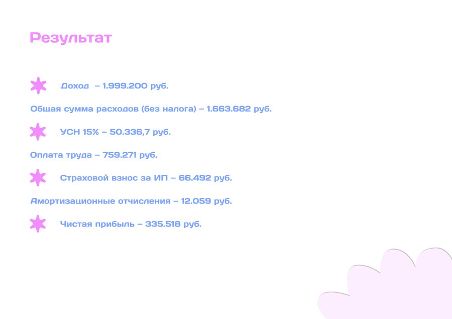 Для ведения бизнеса выбрана организационно-правовая форма ИП с Упрощенной налоговой системой (УСН 15%).