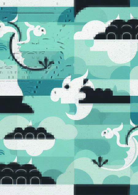 Промт: The pattern is in a minimalistic style. Light and with simple elements. Ease. The sky and the dragons. Blue, white and black colors.