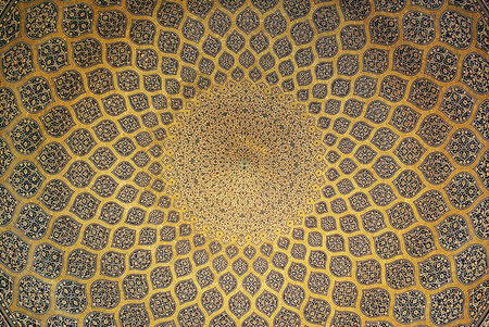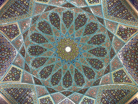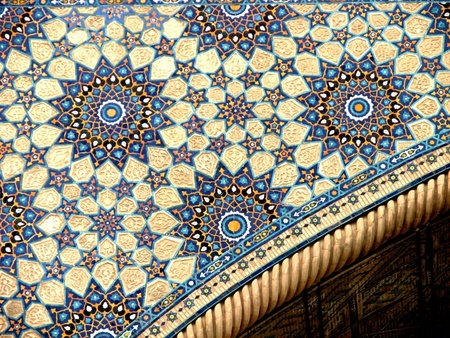 1.Элемент фасада Медресе Шер-Дор. Самарканд, Узбекистан. 2.Орнамент Гирих. Мозаичная отделка купола мавзолея поэта Хафиза в Шира́зе, Иран.