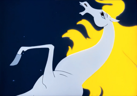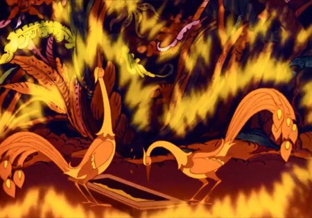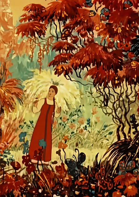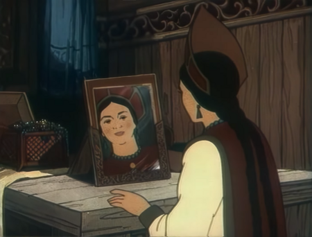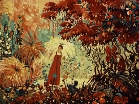 Золотой ассоциировался с сакральным, небесным и царственным. Этот цвет так же позволял передавать сияние и чудесность мира сказки. Для художников анимации эти цвета становились своеобразной визуальной цитатой фольклора