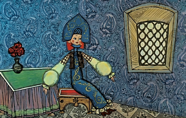 В образах царевен и молодых девушек часто использовалась белая и синяя палитра, подчеркивая их невинность и чистоту, мудрость и внутреннюю гармонию. Белый цвет символизировал свет, искренность и духовную ясность, а синий нежность и спокойствие. Вместе они создавали образ героини, которая олицетворяет моральную чистоту и природную доброту. Эти цвета визуально контрастировали с темными оттенками злодеев и красно-золотой декоративностью царского мира, выделяя