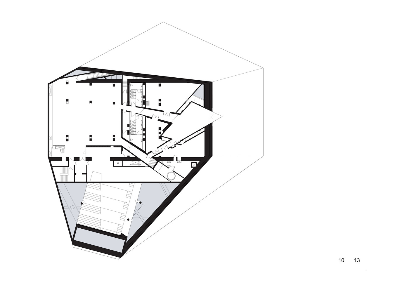 Структура здания по вертикали отражает мысль о необходимости варьировать интенсивность изменений в зависимости от назначения помещения. Первый этаж, тесно связанный с улицей, поддерживает максимум связи с исторической структурой района благодаря вестибюлю и кафе, которые оживляют повседневную жизнь. Концертный зал на втором этаже обеспечивает необходимую звукоизоляцию от внешней среды, что важно для достижения акустического качества. Размещение всех технических систем в подвале делает современную функцию незаметной снаружи.