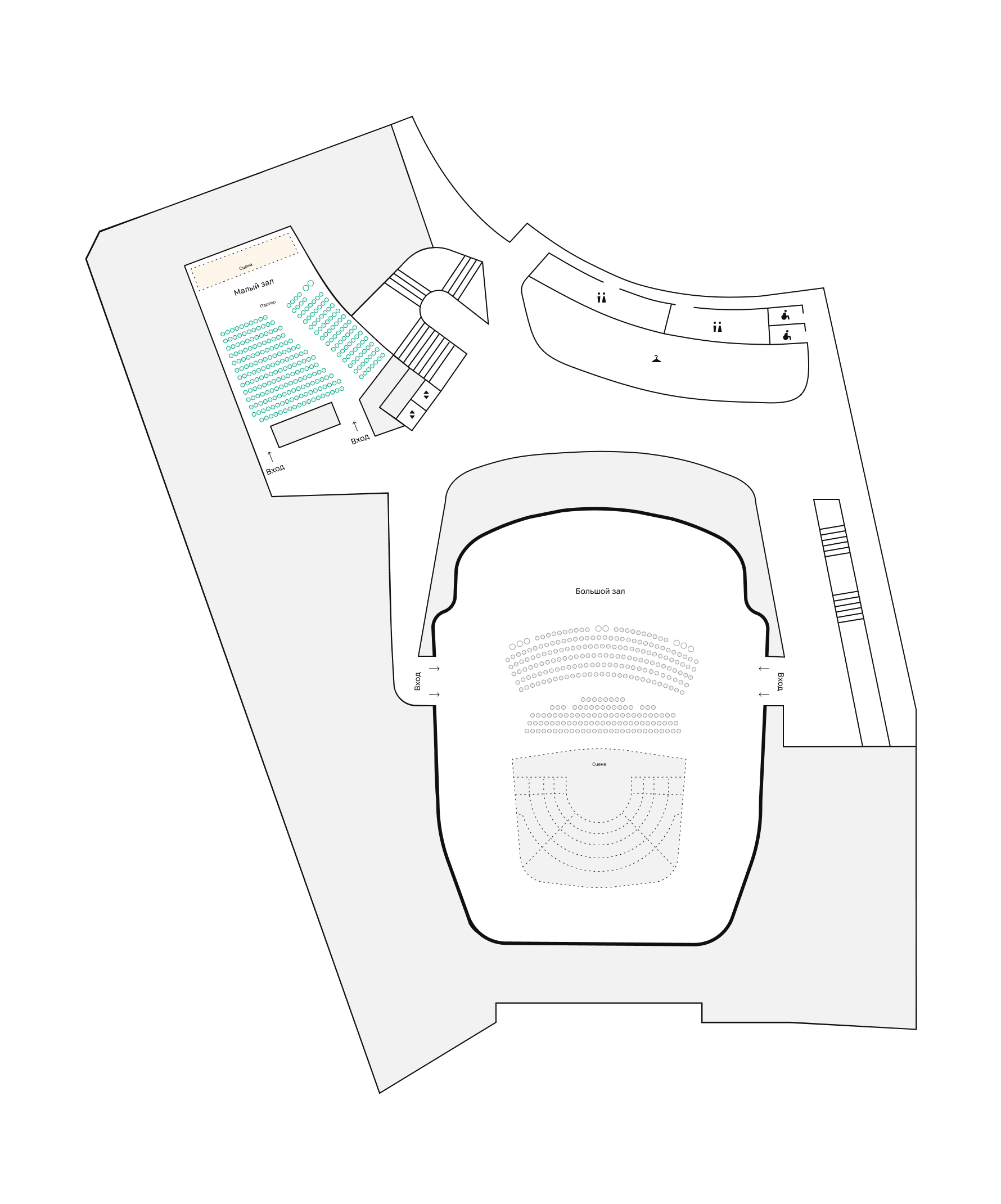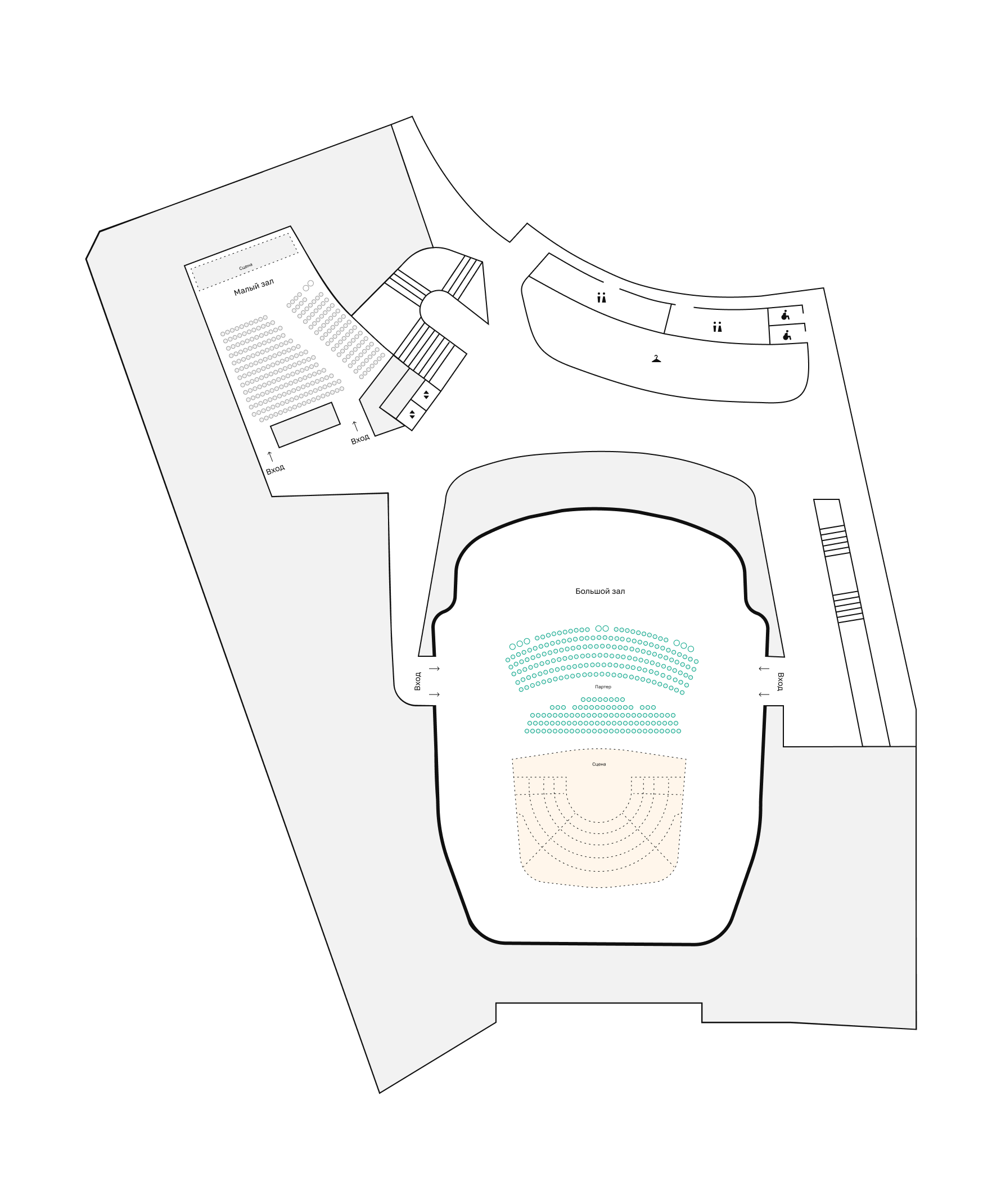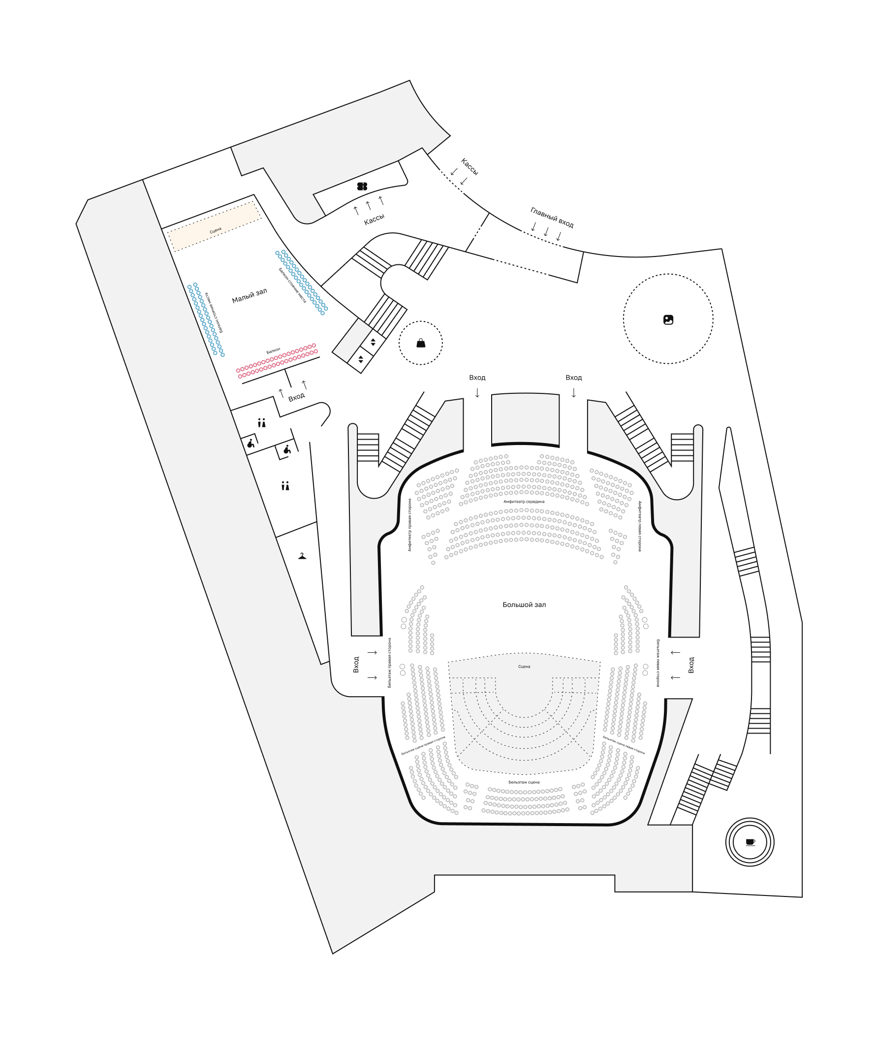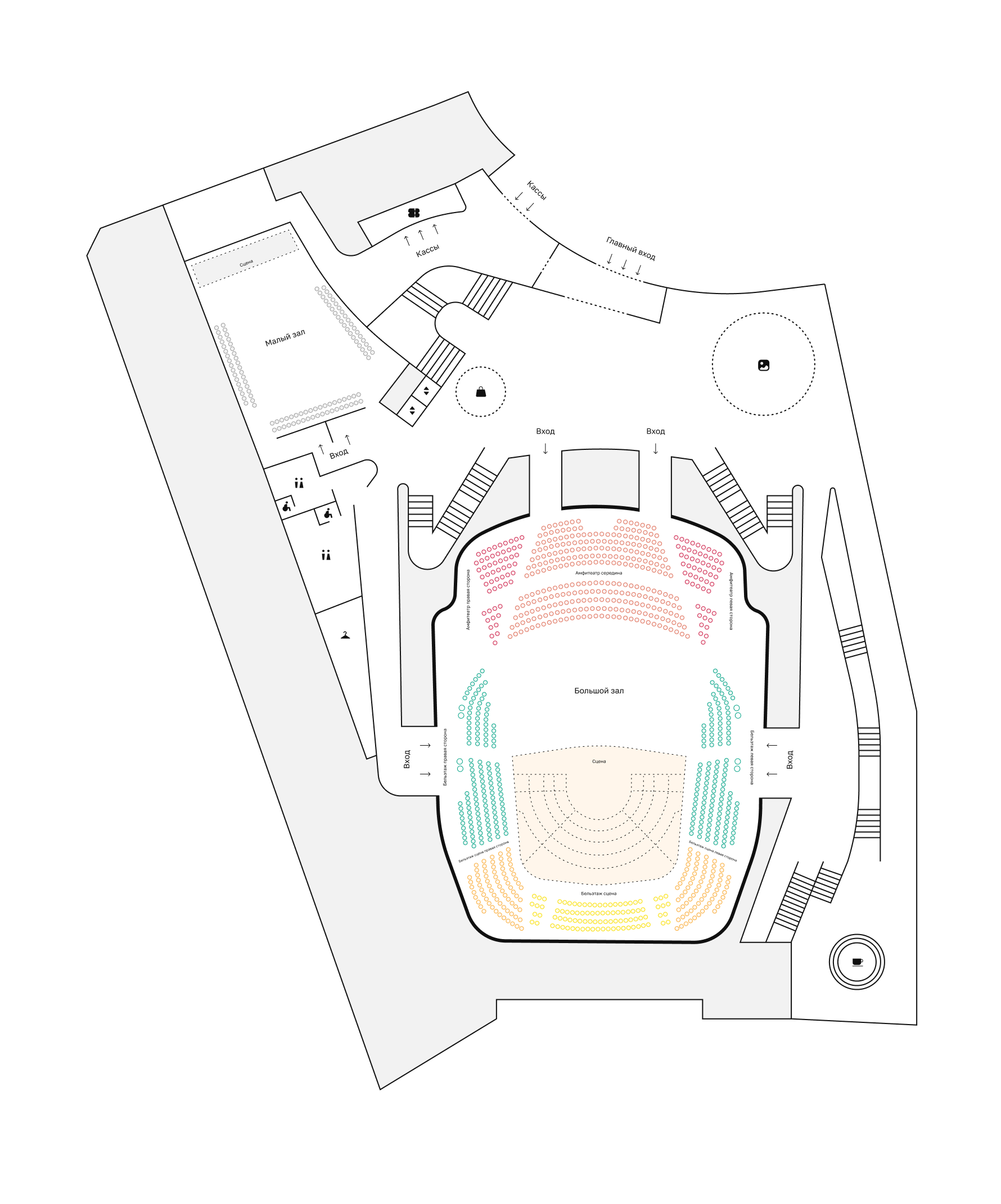 - Главный вход с кассами - Фойе с гардеробом - Музейная зона - Арт — магазин - Кафе/бар - Малый зал / джаз-клуб - Сцена главного зала - Санузлы для зрителей