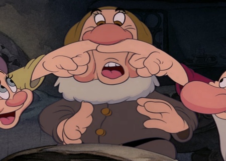 Также сами гномы показываются очень добрыми существами, даже тот же Ворчун принимает Белоснежку, защищает ее, переживает о ней. Гномы всячески пытаются защитить девушку, а также очень долго и горько оплакивают ее в тот момент, когда она якобы умирает. Анимационные герои часто исполняют различные песни, например, когда идут домой или же работают, суть их мелодии заключается в описании происходящего с ними. В момент, когда гномы уходят из шахты видно, что каждый несет на плече какой-то специальный инструмент, что снова подтверждает факт того, что гномы являются ремесленниками. [Рис.63-64]