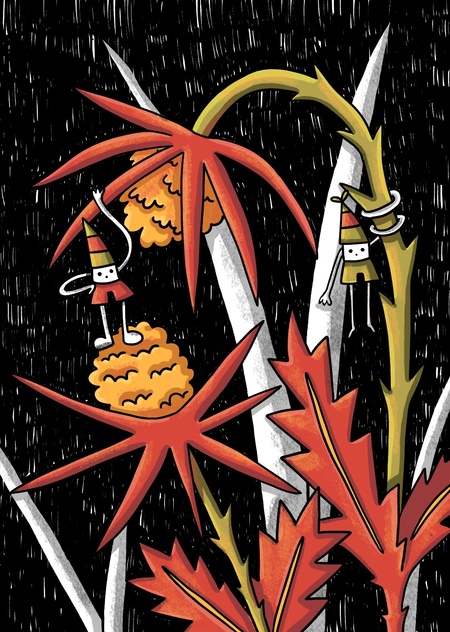 В этой работе гномы показаны как дружный коллектив, защищающий свой мир. У карликов есть свой уклад, есть цель — стать богатыми, чтобы потом все свои сокровища разбросать по небу. В этой работе гномы изображаются как трудолюбивые персонажи, знающие свое дело.