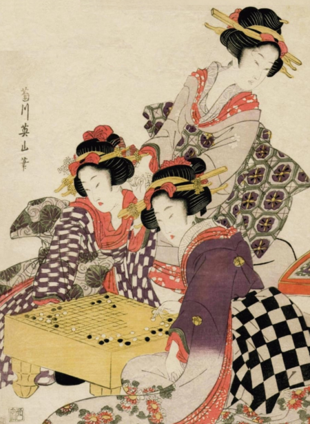 Классическая гравюра, изображающая гобан и го-иши.