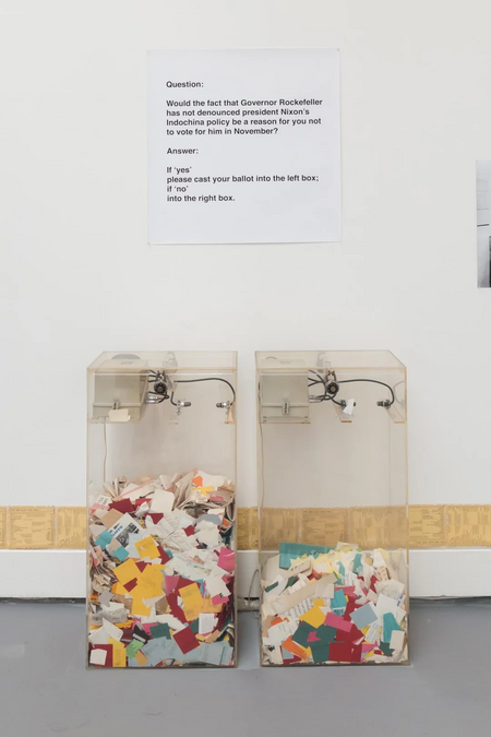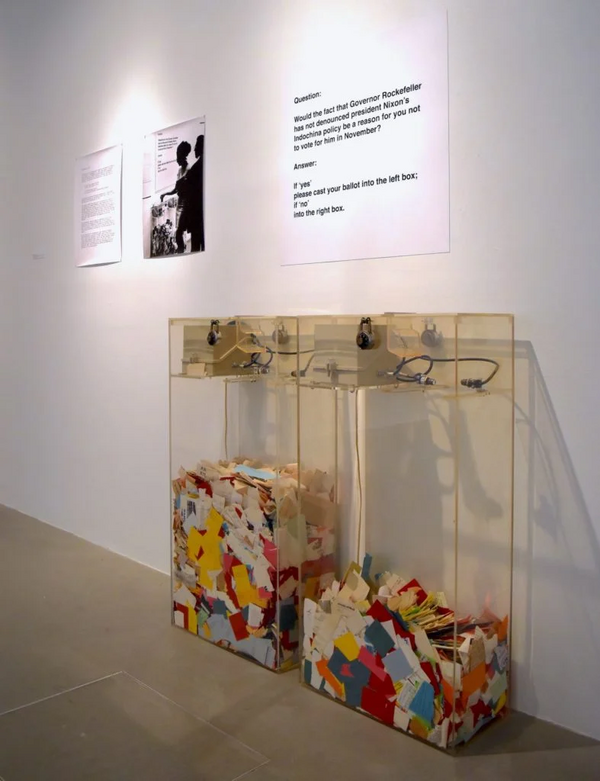 Концептуальные работы Ханса Хааке не могут «застыть». Его инсталляции пропитаны постоянным взаимодействием: со средой, с физикой, природой, человеком или медиа-пространством. На первую очередь выходит процесс, взаимодействие систем, окончательно освобождая искусство от «эстетичного», от репродуцирования.