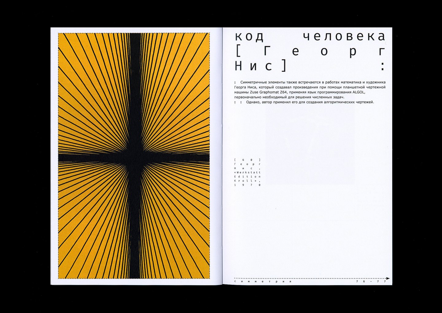 В каждой из трёх основных глав с одной стороны, анализируются природные явления, растения, животные, то, что встречается в природе, а с другой стороны, работы, созданные человеком при помощи компьютера, и далее происходит анализ кода природы и кода человека.
