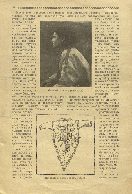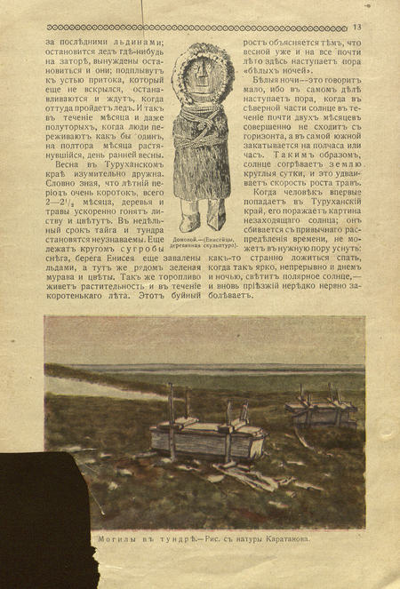 Далее, остановимся на работе Анучина Василия Ивановича, который исследовал жизнь енисейских кетов и самоедов на территории современного Красноярска. Его труды, включая фотографии, собрались в очерке «В стране черных дней и белых ночей» (1916 г.). Это исследование дополнено рисунками с натуры некого Каратанова. В итоге получился симбиоз репортажа с ученой точки зрения и иллюстрации, с точки зрения искусства.