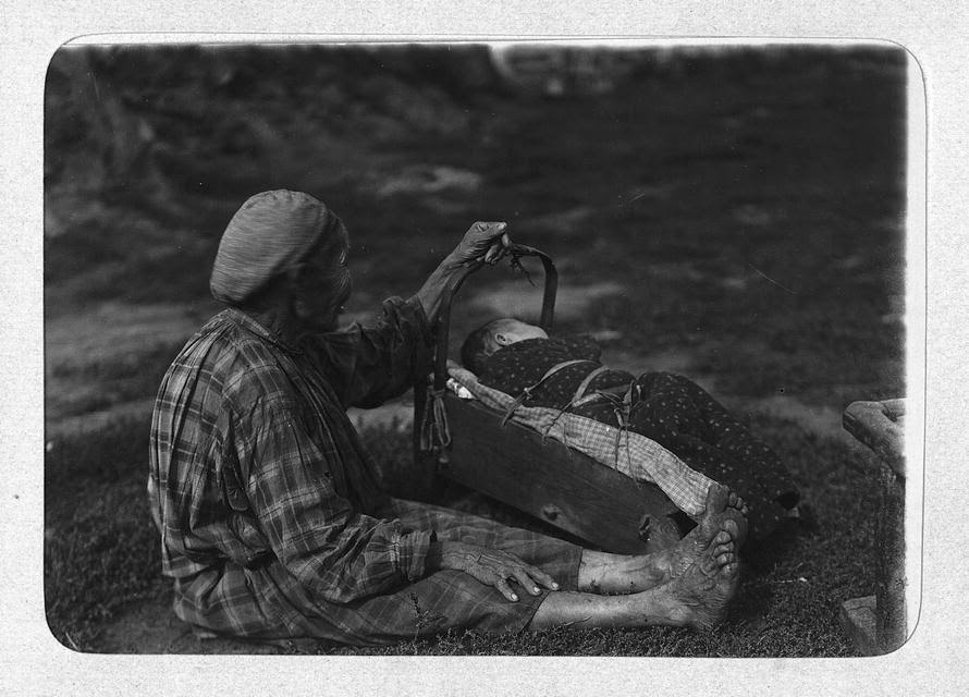 Например, фотография женщины с люлькой: ее фигура отличается одновременно фактурностью — морщины, своеобразная одежда, грубые и уставшие от сельской работы руки, жесткие стопы, требующие отдыха от ходьбы, но также здесь присутствует материнская нежность, уязвимость и хрупкость в лице малыша.