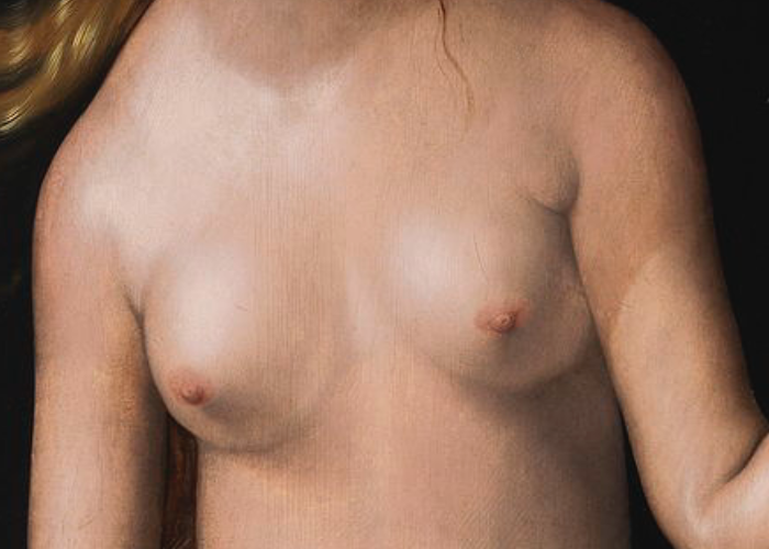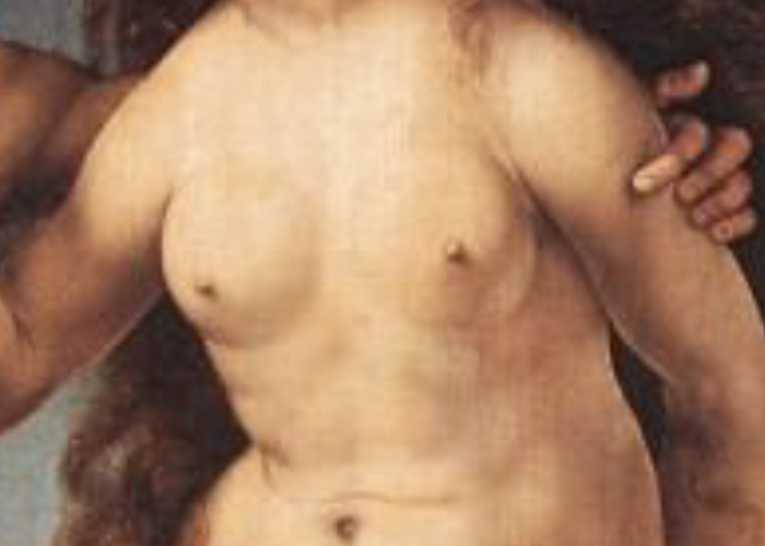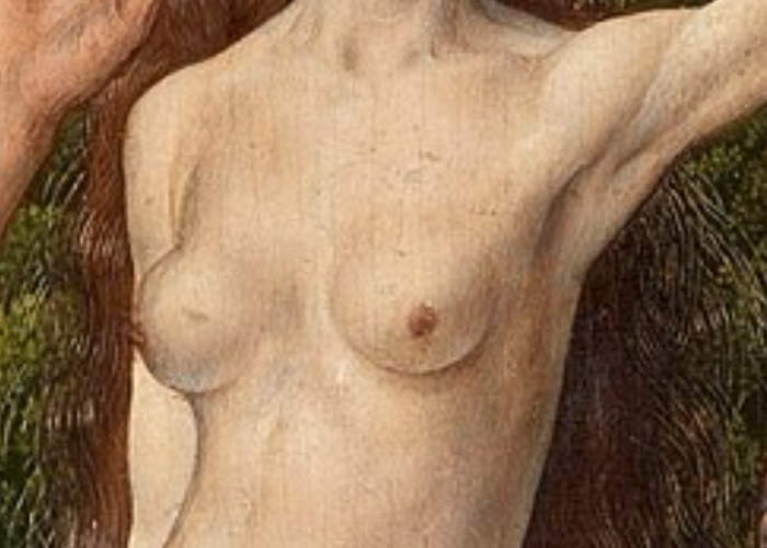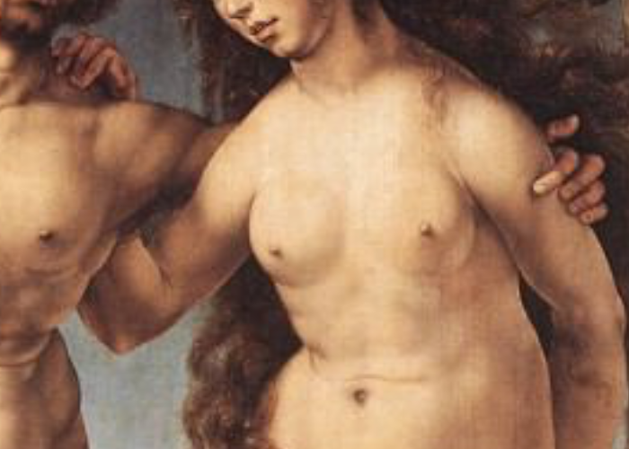 В западноевропейском искусстве эпохи Возрождения и последующих периодов существовала чёткая художественная иерархия телесного: обнажённая женская грудь часто не считалась неприличной и символизировала идеальную, «небесную» красоту, целомудрие или материнство (как, например, в образе Мадонны). Эта небольшая, но важная деталь станет ключевым элементом для анализа поз в изображении Евы, изгнанной из Рая вместе с Адамом — но об этом позднее. Несмотря на уже случившееся грехопадение, Ева всё ещё несколько далека от человеческого восприятия собственной телесности, всё ещё «небесна».