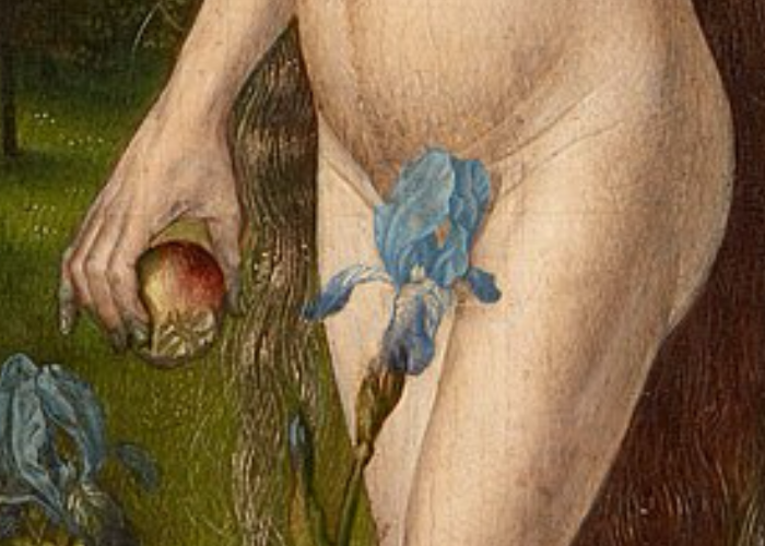 Например, в работе Гуго ван дер Гуса вместо фигового листа половые органы Евы прикрывает цветок ириса — можно предположить, что выбор обусловлен смежностью внешнего вида цветка и женских гениталий.