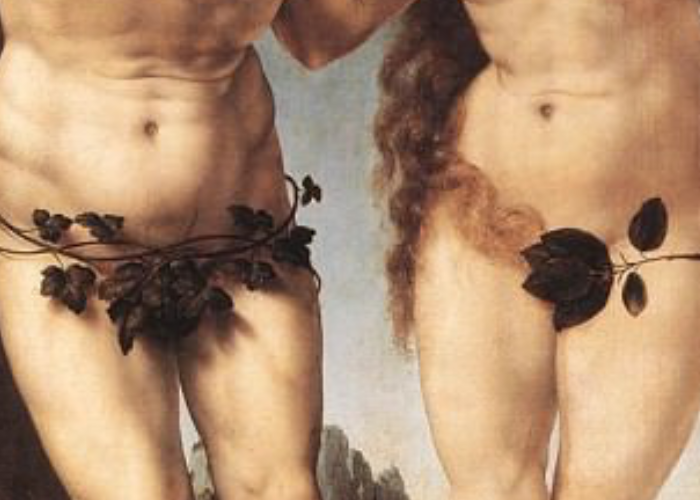 Непорочная нагота сменяется внезапным пониманием собственной «греховной природы», отделяя невинность от знания. Листья, прикрывающие половые органы Адама и Евы — один из символов разрыва между Богом и человеком.