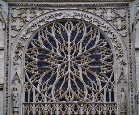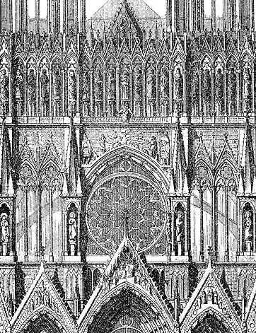 Западная (большая) роза Реймсского собора — характерный элемент фасада в стиле высокой готики. Ее диаметр составляет примерно 12,5 м. Конструктивно она отличается довольно тонким переплетом, который стал возможен благодаря техническому прогрессу. Многочисленные каменные мульоны расходятся радиально из центрального окулуса и образуют сложную, ажурную сеть, в которой стекло занимает большую часть проема, что снижает массу камня и визуально «растворяет» стену. Дополняют конструкцию контрфорсы и система летающих арок, которые несут боковую нагрузку.