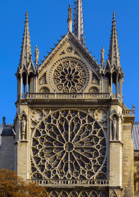 Северная роза собора Нотр-Дам де Пари была выполнена примерно в 1250 году, когда трансепт храма был удлинен, чтобы вписать более крупное окно. Ее диаметр составляет около 12,9 м. Конструкция окна состоит из радиального переплета: каменные лучи расходятся из центра, что позволяет стеклу занимать большую площадь проема и усиливает эффект светопропускания. Благодаря системе контрфорсов и летающих арок нагрузка от обширного круглого окна распределяется эффективно, и фасад остается устойчивым.